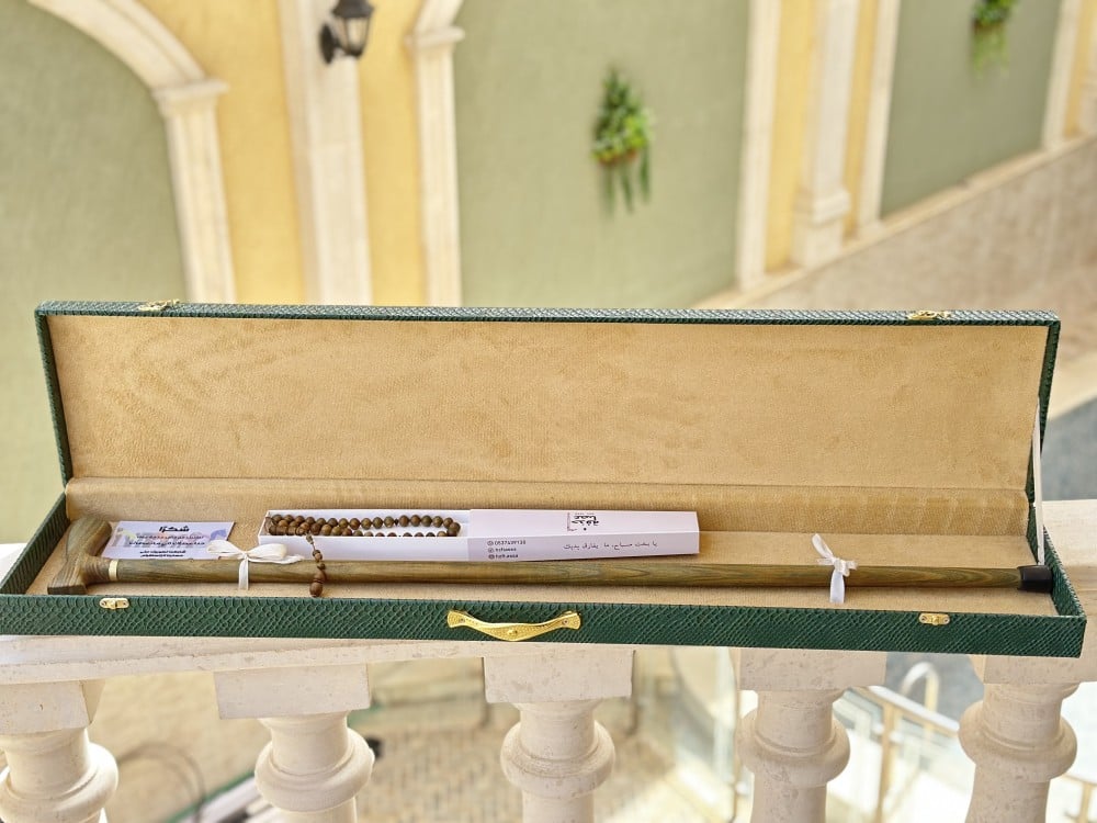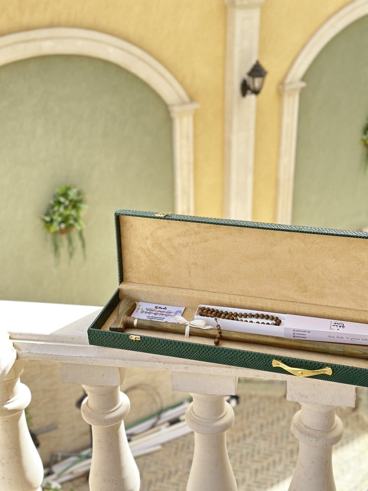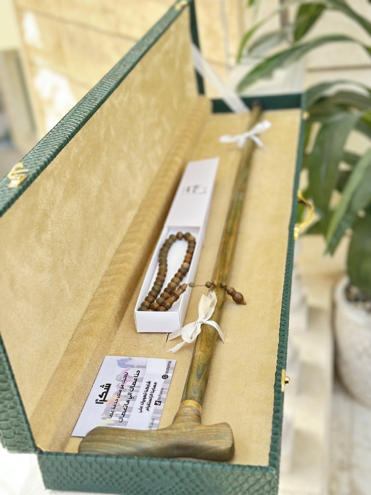 طقم يتكون من عصا ومسباح من خشب الصندل الفواحبرائحه جميله رائحة الخشب الصندلوالمسباح كذالك من نفس الخشب وفواحه رائحتها