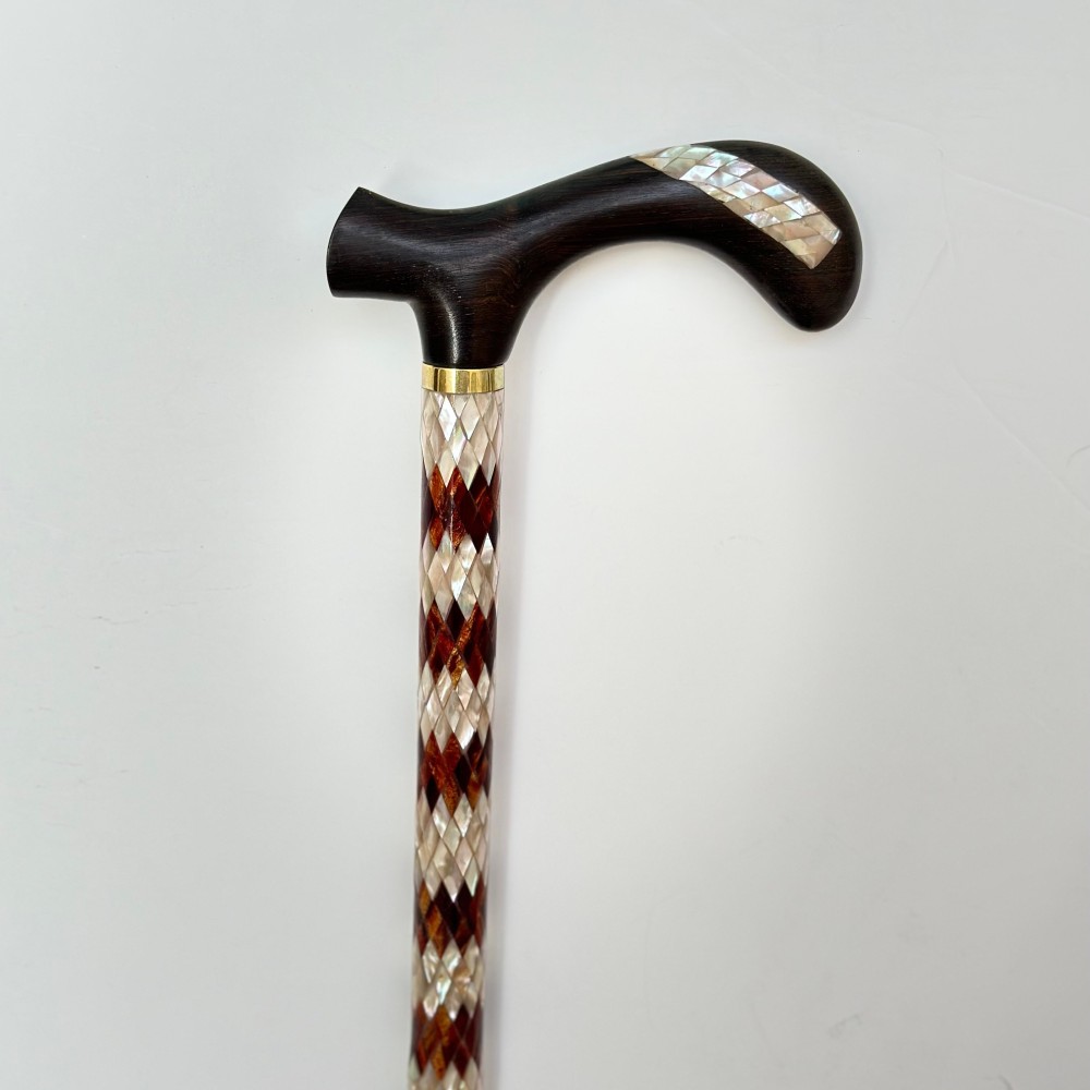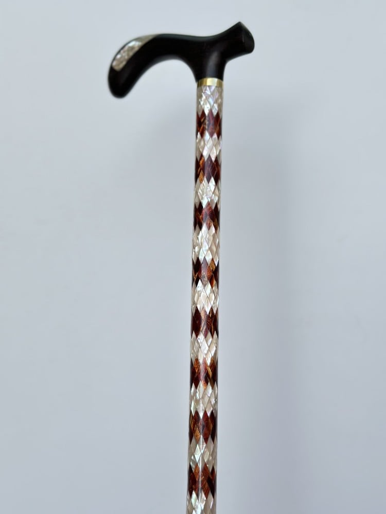 عصا عكاز فاخر مصنوع من خشب الطبيعي ,مزين بالصدف البحري على شكل معينات ,بمقبض ناعمة الملمس ,صناعة يدوية على ايديامهر الحرفيين المختصين في تصنيع عصا العكاز الاخشاب الطبيعية ,وتم صقلها بإحترافية متعددة الاستخدام